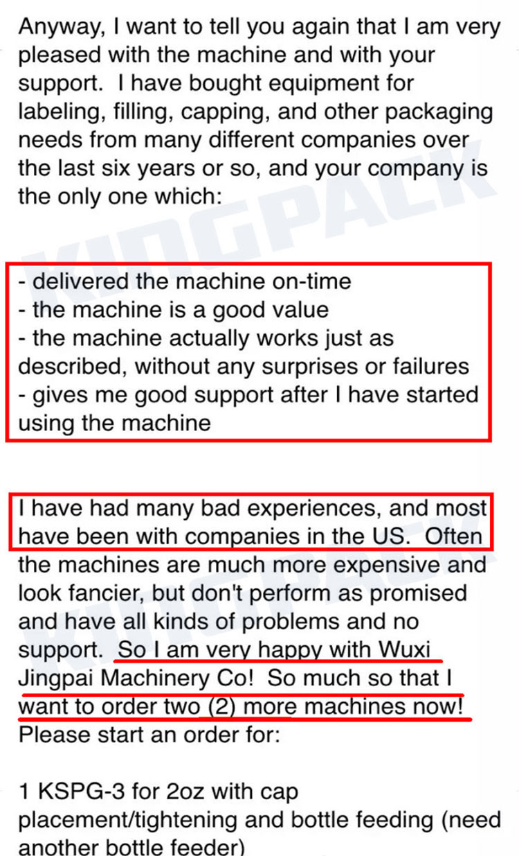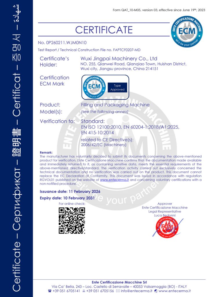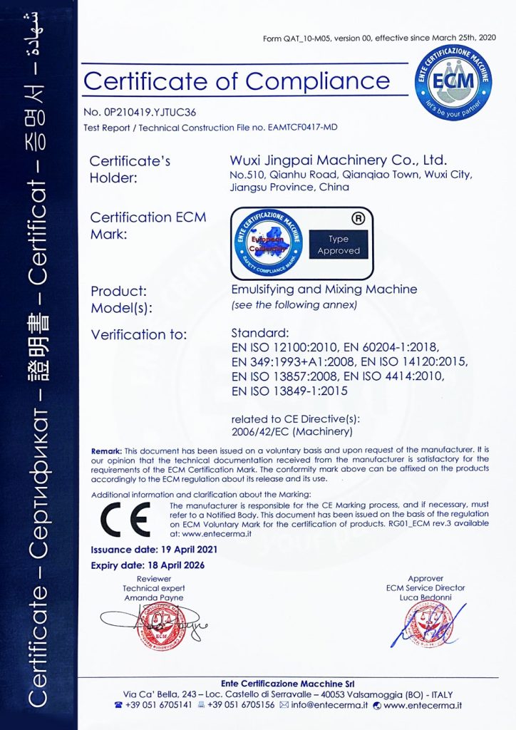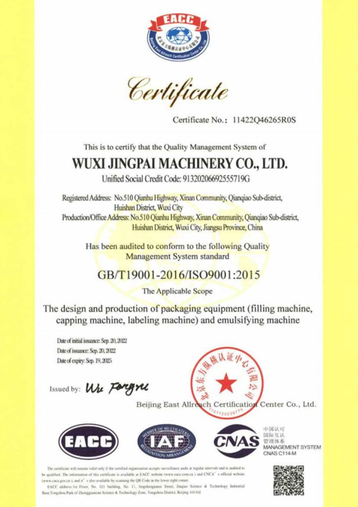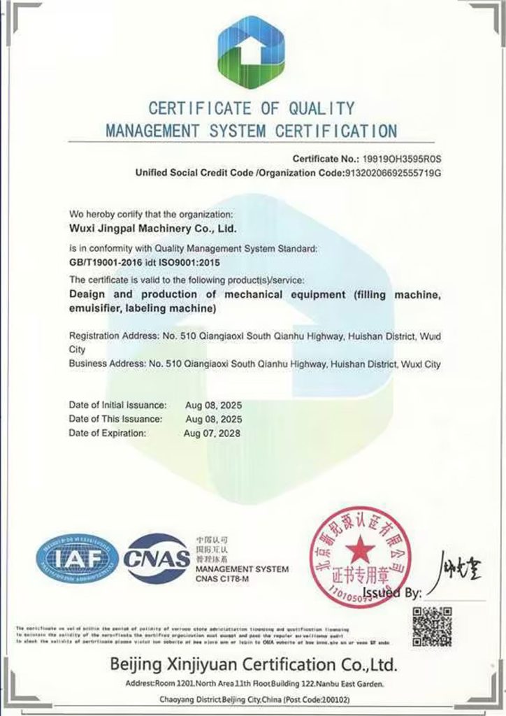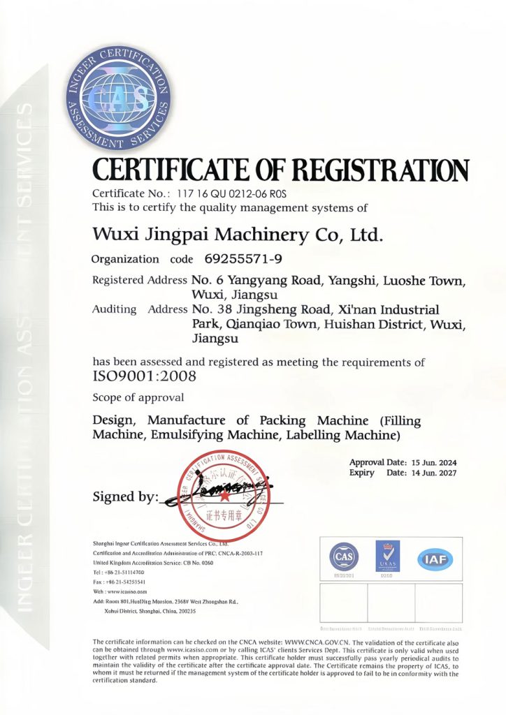 ООО Уси Цзинпай Машина (King Pack Machinery), основанная в 2009 году, является ведущим китайским производителем комплектного оборудования для эмульгирования и упаковки с дозированием, стремящимся помочь клиентам в модернизации производства для соответствия нормативным требованиям, повышения эффективности и внедрения интеллектуальных технологий. Мы являемся национальным высокотехнологичным предприятием с более чем 20-летним опытом работы в отрасли. Мы специализируемся на разработке и производстве вакуумных лопастных гомогенизаторов, полностью автоматических тубонаполнительных и запаечных машин, а также линий розлива и упаковки.